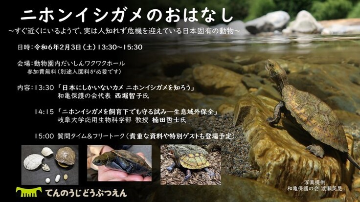 前半,和亀保護の会 代表の西堀智子さんが「日本にしかいないカメ ニホンイシガメを知ろう」についてご講演されます。そのあと楠田が「ニホンイシガメを飼育下でも守る試み―生息域外保全」として,当研究室で行っている岐阜でのニホンイシガメの野外調査や域外保全の取り組みの話に加え,天王寺動物園の域外保全開始の際にたまたま縁あって間接的に関わったので,そのお話をさせていただく予定です。