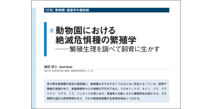楠田哲士.2021.動物園における絶滅危惧種の繁殖学─繁殖生理を調べて飼育に生かす.生物の科学 遺伝75(2):136-145.