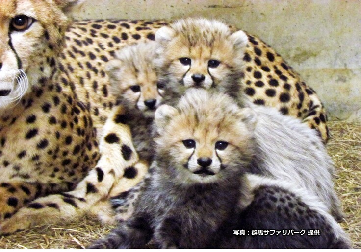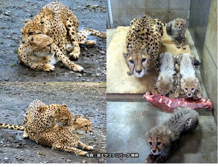 左はチーターの交尾の様子,右は生後78日目の子どもたち
