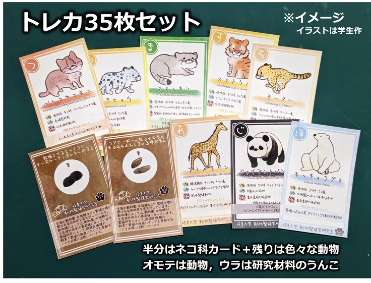 動物繁殖学研究室の学生たちと一緒に考えてきた研究動物のトレカです。35種類のカードのうち約半数の19枚はネコ科動物です。ネコ科動物は現在研究対象の種・亜種と過去に研究した種・亜種を含みます。マヌルネコカードも入っています(下の写真の上段・真ん中)。残り半分は,現在研究中の一部の動物たち。イラストは,学生が描いたものです。オモテ面は動物の紹介,ウラ面は研究材料の糞です。研究室の学生たちの多くは,糞の形状やニオイから,だいたいの動物種を当てられます・・・。