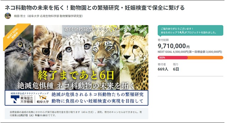 この度は,【ネコ科動物の未来を拓く!動物園との繁殖研究・妊娠検査で保全に繋げる】をご支援・応援くださり誠にありがとうございます。