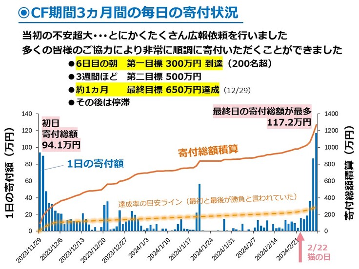 ●クラファン期間3ヵ月間の毎日の寄附額の推移です。棒グラフは1日の総額,オレンジ色の実線はその積算額です。スタート時とラストスパートで特に多くの方のご支援をいただきました。