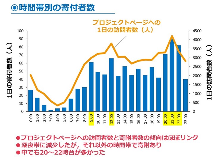 ●プロジェクトページへの訪問者数や寄附申し込みをいただいた人数を,1日24時間の中で1時間ごとに集計したグラフがこちらです。ほぼすべての時間帯に訪問いただいていますが,特に,9時台,12時台,20-22時台に多くなっているようです。