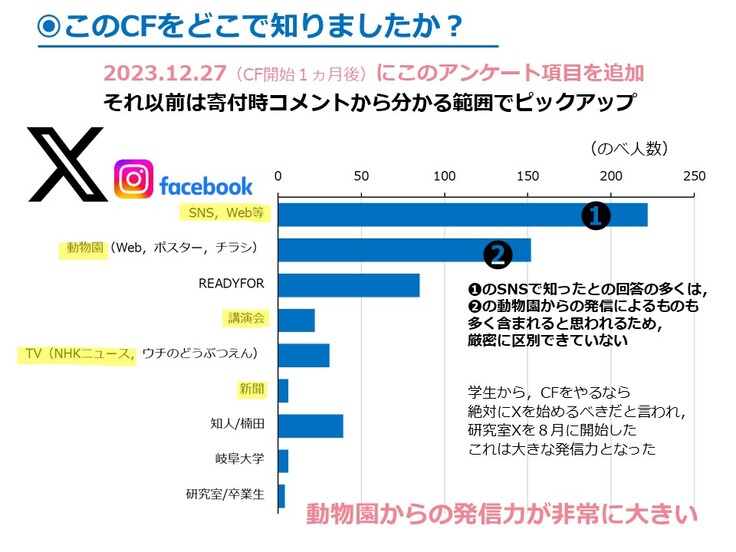 ●このクラファンをどこでお知りになられたかを,クラファン開始1ヶ月後くらいから,寄附時にお尋ねする項目を追加させていただきました。ほとんどが動物園からのSNS発信(特にX)によるものだと思います。ご協力いただいた動物園やそのXをリポストいただいた皆様にも感謝申し上げます。