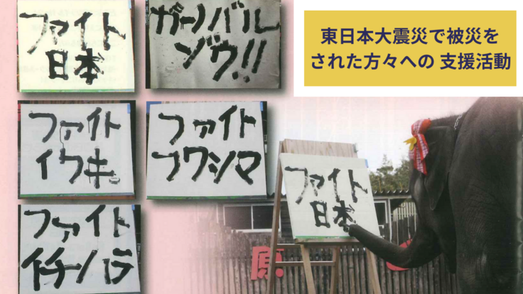 市原ぞうの国では、東日本大震災の被災地にエールを送りました。字や絵をかくことができるゆめ花は、長い鼻を使って白いキャンバスに「ファイト日本」と書きました。被災地を励ますメッセージを送ろうと考え、スタッフがゆめ花と一緒に特訓したところ、約1週間でかけるようになりました。