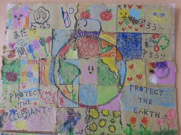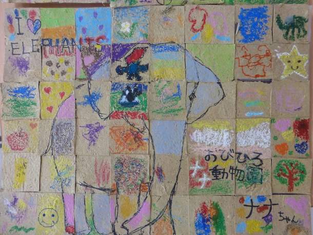 ワークショップは「みんなで象のうんこアートを作ろう!」と言うことで、パズルみたいにバラバラになった絵をみんなで色塗りして絵を完成させました♪