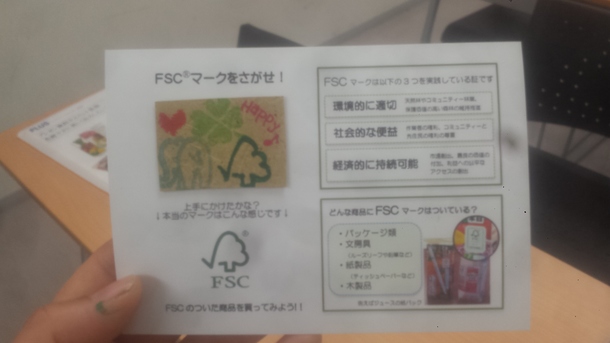 木材利用のための森林伐採がにより、森が少なくなってきたけれども、森の木を使わずに生活することは難しいので、経済と森林保全のバランスをとりながら利用する条件のもとで伐採された木材や商品にはFSCマークがついています。