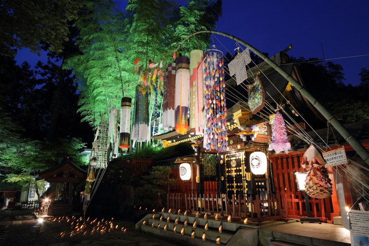 色鮮やかな吹流しや竹灯籠で照らした参道はまさに幻想的な雰囲気となっております。
