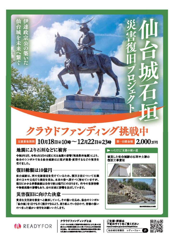 詳しくは、仙台城石垣災害復旧クラウドファンディングのページをご覧ください。(外部サイトへリンクします)