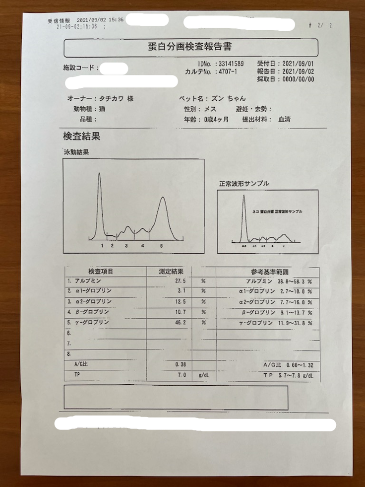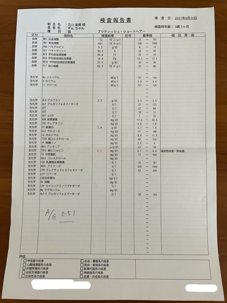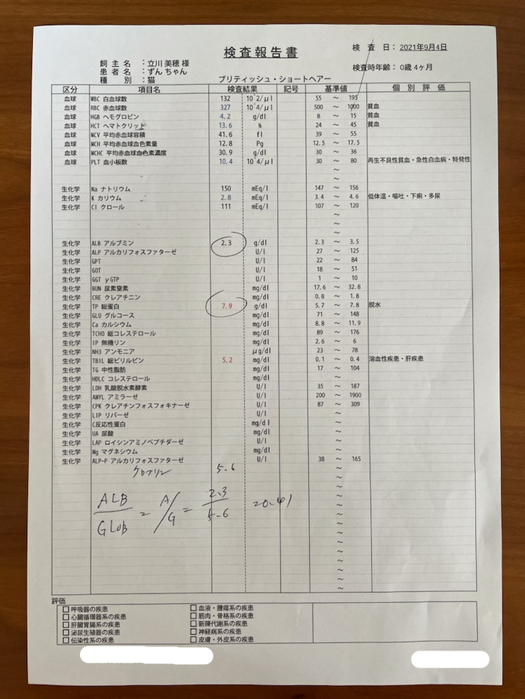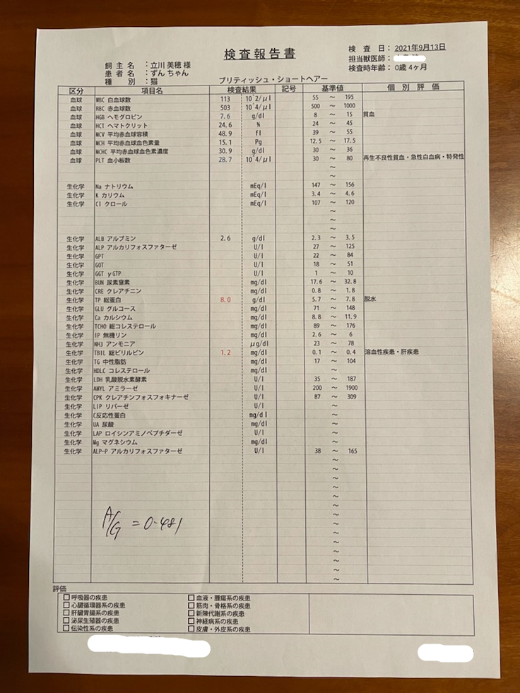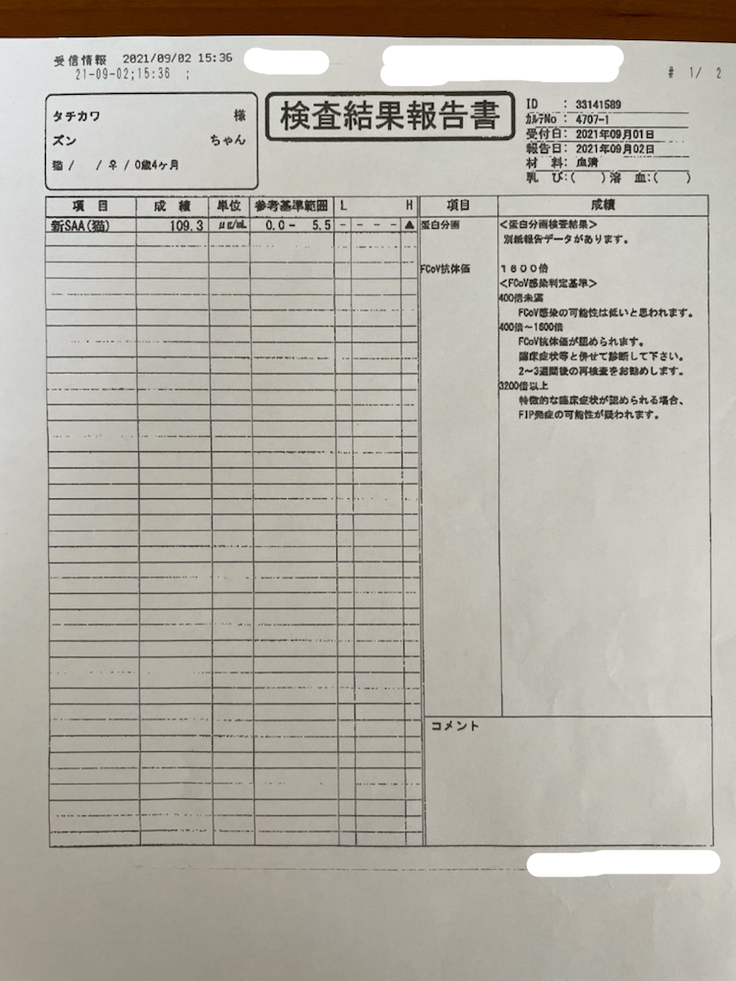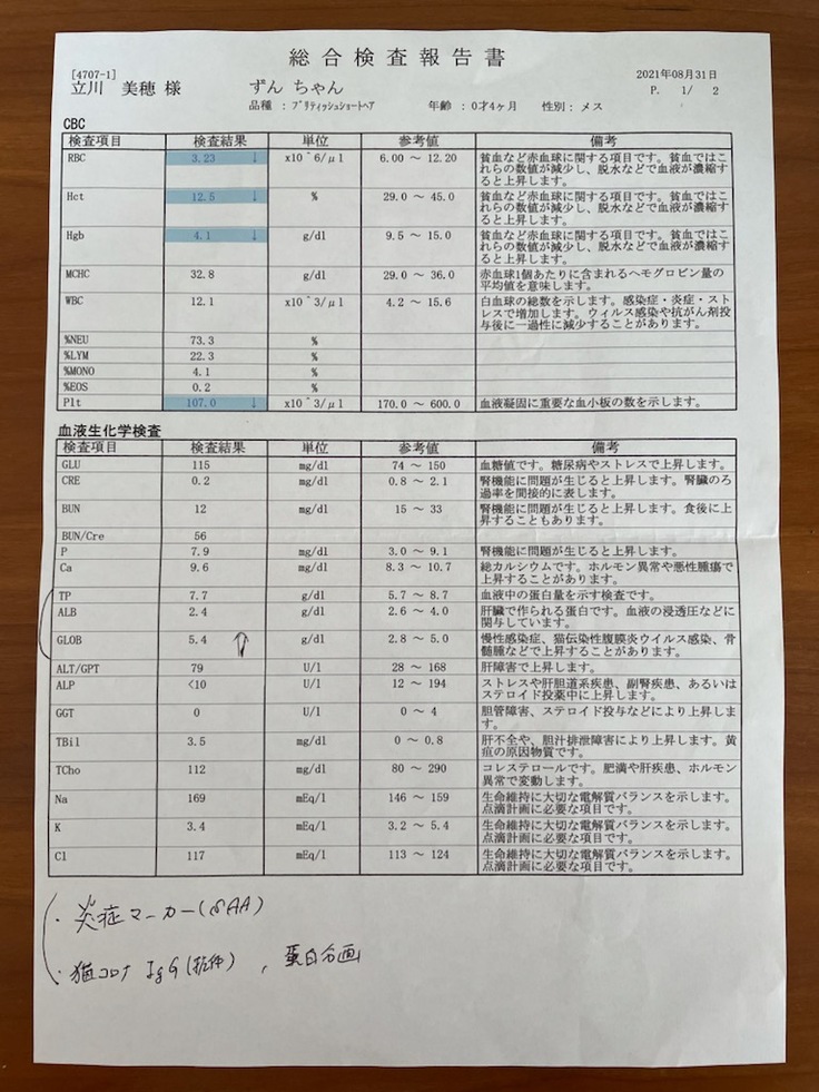 熱は39.5℃、採血結果は貧血が進んでいて、黄疸とグロブリンの値が高く、FIPの疑いがあると言われました。超音波では腹水や胸水はなく、はっきりとFIPと診断できないため、炎症マーカー(SAA)と猫コロナ抗体、蛋白分画の検査をし、検査結果が出るまでステロイド剤を内服して、様子をみることになりました。