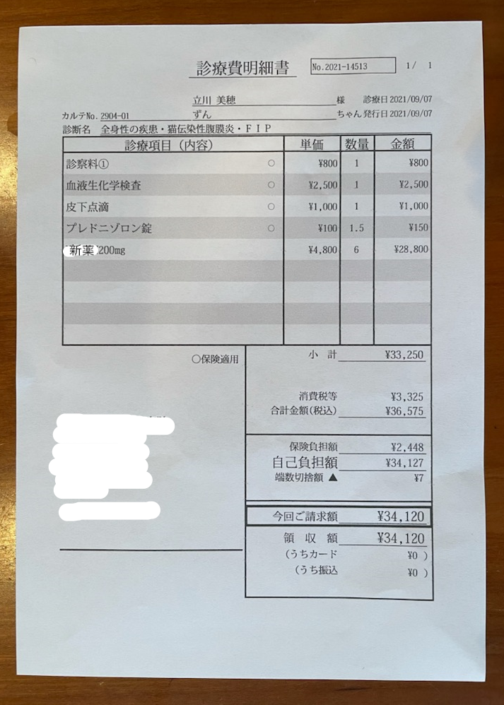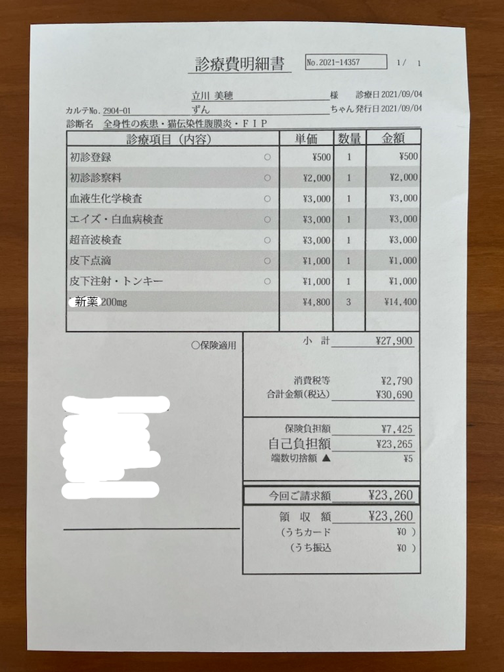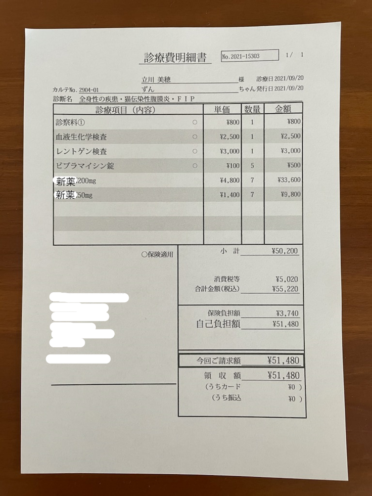 夜の診察時間外に来院し、診察していただきました。採血、超音波検査の結果、FIPのドライタイプ中後期と診断されました。脱水と貧血がひどいため、点滴と鉄剤の注射をしてもらい、新薬を3日間処方していただきました。