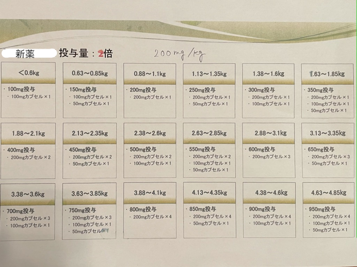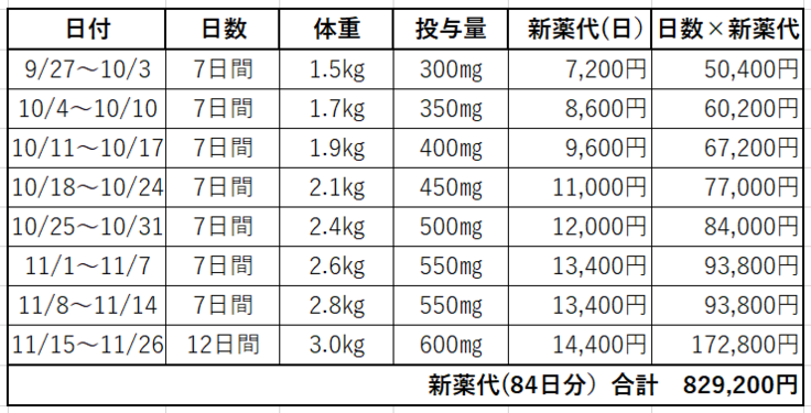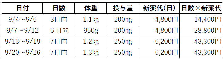投与開始のずんの体重 1.1㎏ 200㎎ 4800円/日