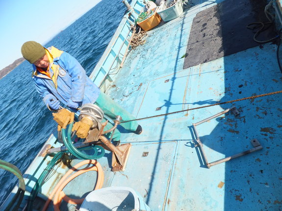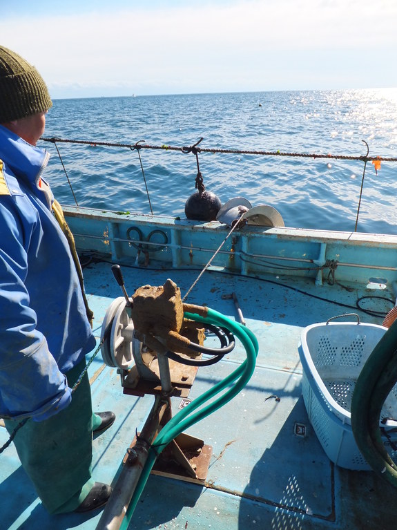 今年9月ごろ出荷予定のまだ小さいホタテです。この滑り台で海から上がってきます。